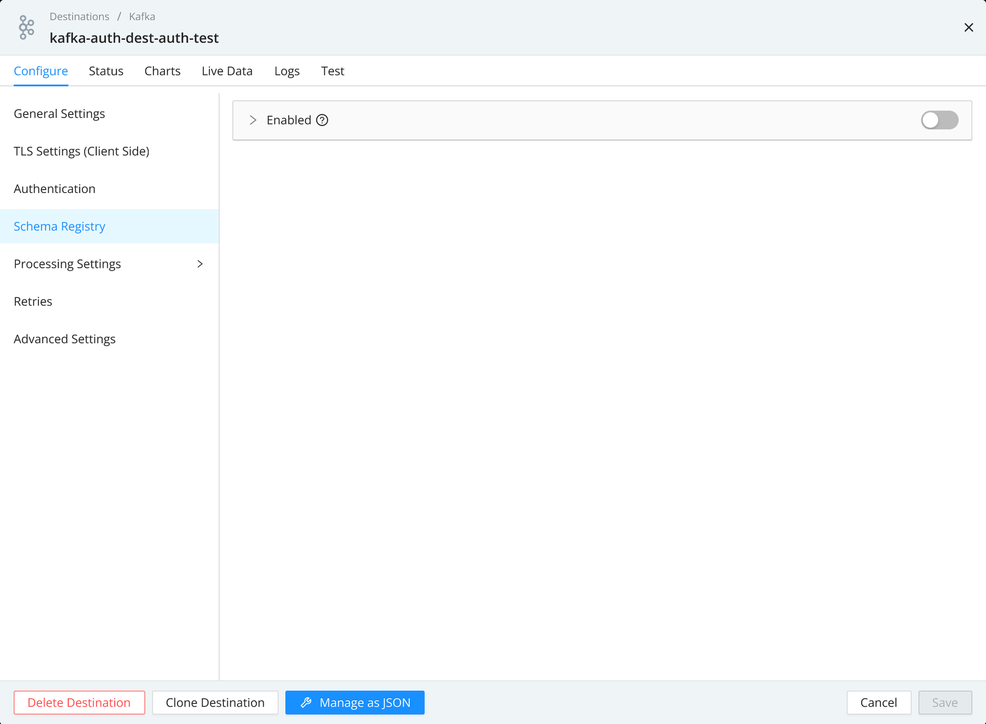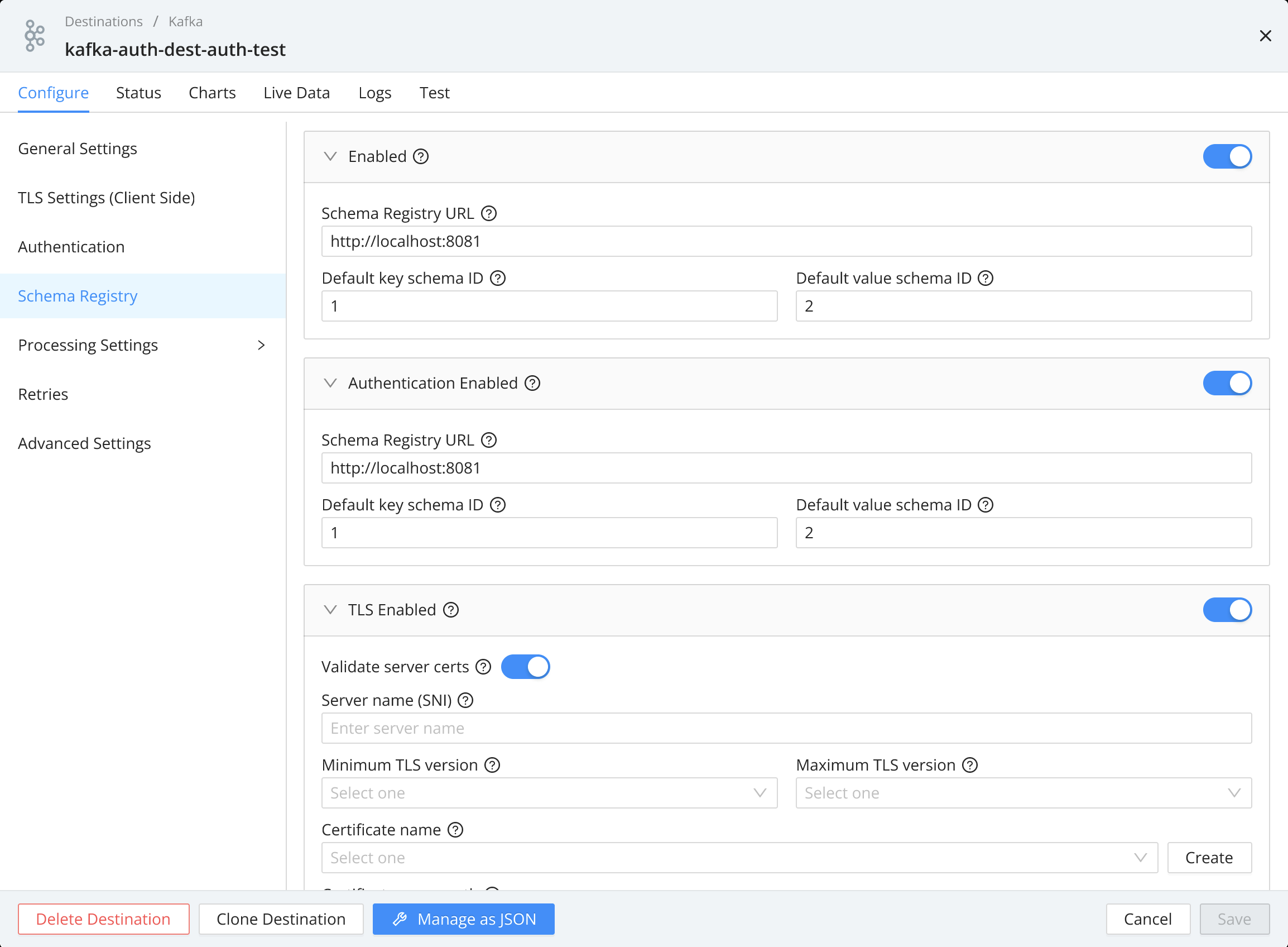 We are working with Aaron Whittier on redesigning the Schema Registry section of the Kafka destination configuration to accommodate three sections that require enabling. We designed and created a clickable prototype to illustrate interaction. Currently using progressive disclosure but will revisit at a later date to determine how we want to treat configuration screens throughout the product suite.