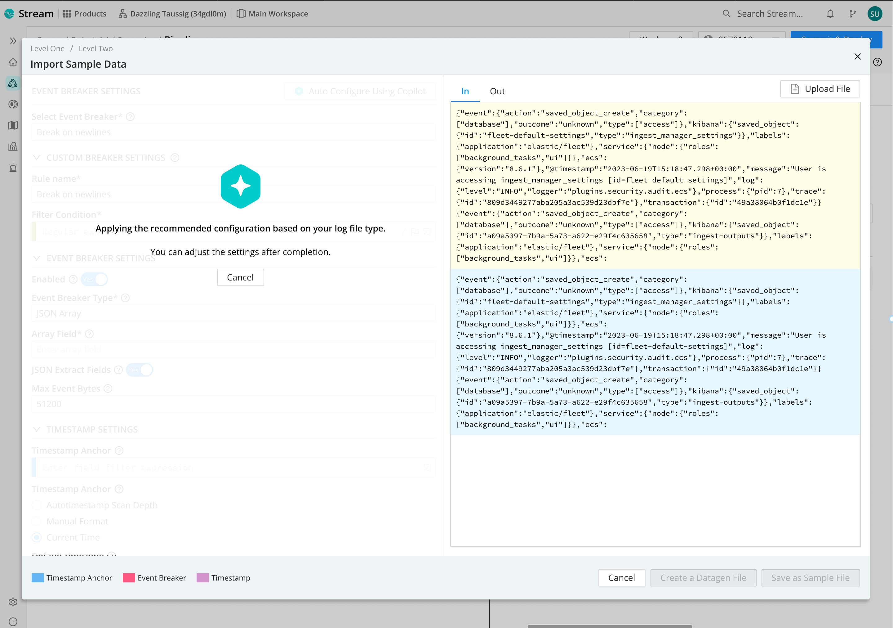 The problem we're trying to solve is a user has a sample log file from an external system that they want to run through Stream to assure the pipelines they configure are going to work properly once log data begins to flow from their sources to their destinations. This is exploration is to see if the Copilot can detect the log file type then auto-magically suggest the best config for the file type. Draft is out to small Ai internal team for review as well as Dritan. Figma | JIRA TBD